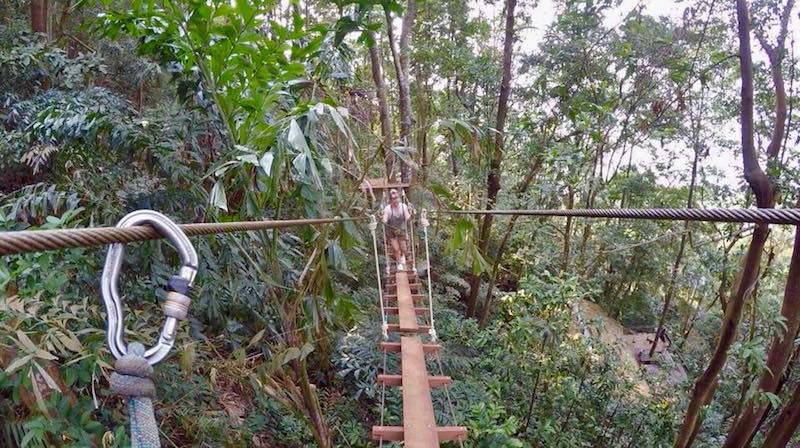 There are 3 tracks, one for kids, one blue for beginners, and the red one for the most adventurous with a series of swinging platforms, treetop walks, slackline, bridges, Tarzan swing, flying bike and skateboard, and zip lines. The red track has 2 giant zip lines with one of 200 meters long over the treetops and from where you will see all Bailan.